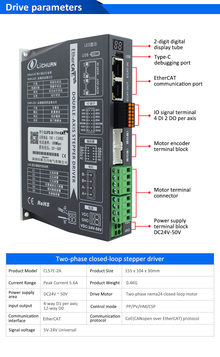 EtherCAT 2-faset Nema24 4-akset DC lukket sløjfe stepmotor driversætNye produkter EtherCAT 2Phase Nema24 2-akset DC lukket sløjfe stepmotordriversæt fremstillet i Kina med CE/ROHS fra LICHUAN®. Vores fabrik er en berømt EtherCAT 2Phase Nema24 2-Axis DC Closed Loop Stepper Motor Drivers Kit producenter og leverandører i Kina. Vores produkt er af høj kvalitet/holdbar/stabil drift og billig pris. Og vi leverer skræddersyede tjenester.